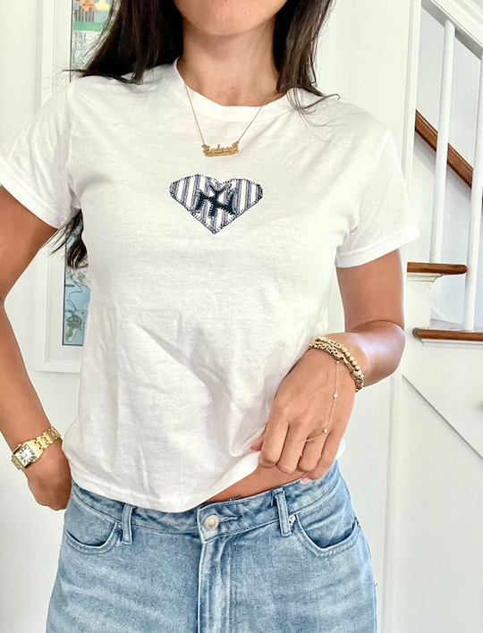 A crisp white tee featuring a bold striped heart with a classic Yankee logo at its center — the perfect blend of hometown pride and playful style. Whether you're headed to the game or just repping your team in everyday wear, this tee is a home run.